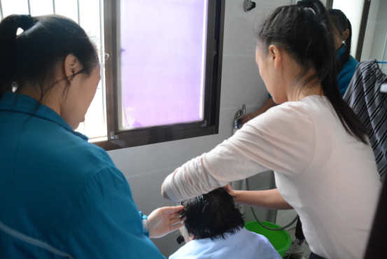 志愿者给老人洗头