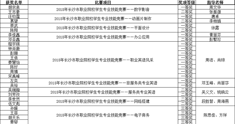 在刚刚结束的2018年长沙市职业院校学生技能竞赛中,我校选派的26名选手在9个项目中斩获一等奖14项、二等奖8项、三等奖4项,其中网络搭建、数字影音、动画片制作以及非服务类英语4个赛项顺利晋级省赛。