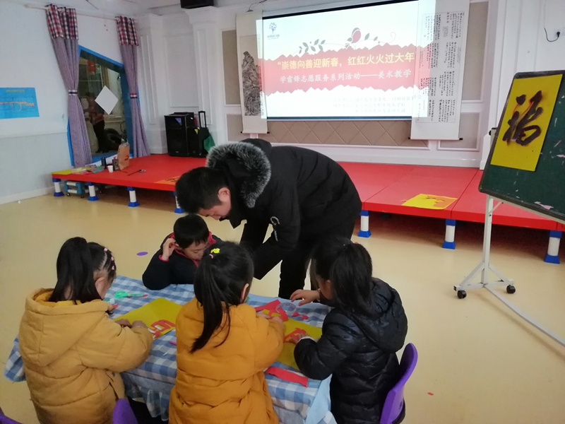作为学校和同升街道白田社区党建共建的一项重点项目,这所容纳200多名孩子的普惠性幼儿园已经成为了学校党委与同升街道社区党组织党建共建,服务群众的完美融合点。志愿者们迎着湿冷的冬雨大清早就来到了幼儿园,党员教师杨林刚到幼儿园就紧锣密鼓地为小朋友们准备游戏材料,剪刀、卡纸、双面胶……党员教师李剑波以“识福字、剪福字”为主题给小朋友们带来了一堂生动的美术游戏课。课堂上,小朋友们认真听、合作剪福字、贴福字,其乐融融。一年来,学校学前教育专业的师生已经到长沙市各幼儿园见习20余次,每次见习既提高了学生们的专业技能,又为幼儿园带来创新的幼教保育思想和做法。