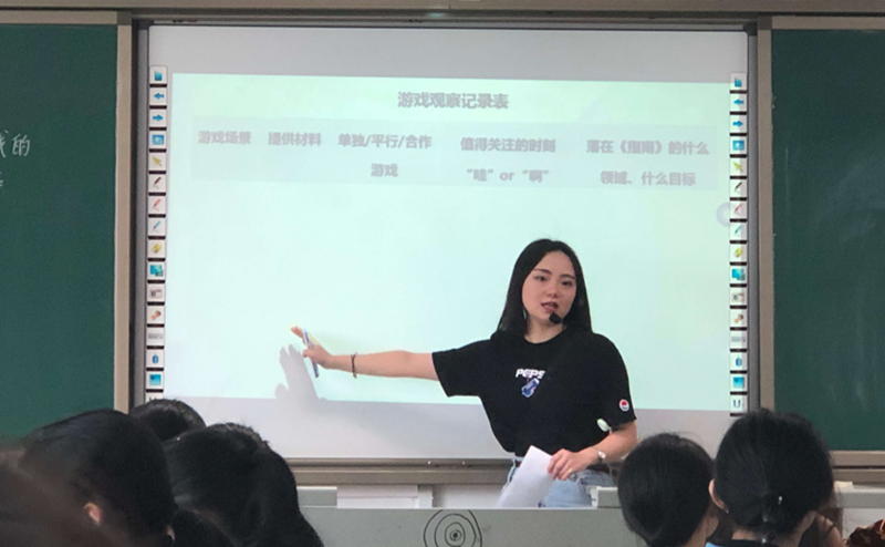 6月25日第六节课,新进教师郭念舟在德馨楼1605班开展了这学期的汇报课《幼儿园大班角色游戏的观察分析与指导》。郭老师从学生的职业发展出发,选题贴合学生的实际需求,以视频案例分析的形式,带领学生环环紧扣、层层深入的结合《3-6岁幼儿学习与发展指南》,剖析幼儿的游戏行为,了解幼儿的发展水平;通过小组研讨的方式,引导学生自主学习,针对幼儿的行为,制定相应的游戏指导措施。教师熟练运用现代教育信息化的手段,课堂整体氛围活跃,学生积极参与,充分体现了以学生为中心教学理念,让学生在解决问题的过程中,获得知识和技能。教学效果良好,重难点突出。