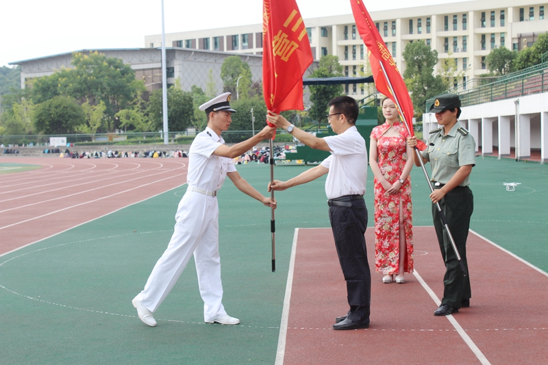 校长郭正良向长沙幼儿师范学校军训营授旗,各军训教官依次接旗。他向全体新生表示热烈的欢迎,向即将为本次军训付出辛苦劳动的全体教官同志们,表示衷心的感谢。他要求全体新生从军训开始去领悟、去探索职高三年如何度过;要明白自己的身份与使命;要团结互助共同成长;希望2019级同学们能不负众望,以自己的拼搏努力顺利完成军训任务,向教官、向家长、向老师、向学校交上第一份优秀的答卷。