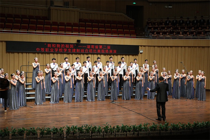 夜幕下的星城灯火闪烁,肃穆的长沙音乐厅星辉灿烂,由湖南省教育厅主办,湖南教育电视台承办,长沙市教育局协办的“我和我的祖国”湖南省第二届中等职业学校学生建制班合唱比赛现场展演,于10月31日晚举行。省教育厅巡视员应若平代表省教育厅出席展演并讲话。长沙幼儿师范学校教师代表受省教育厅邀请作为第一个展演节目和在全省各地市州合唱比赛中脱颖而出的14个一等奖获奖班级为现场观众带来了精彩演出。