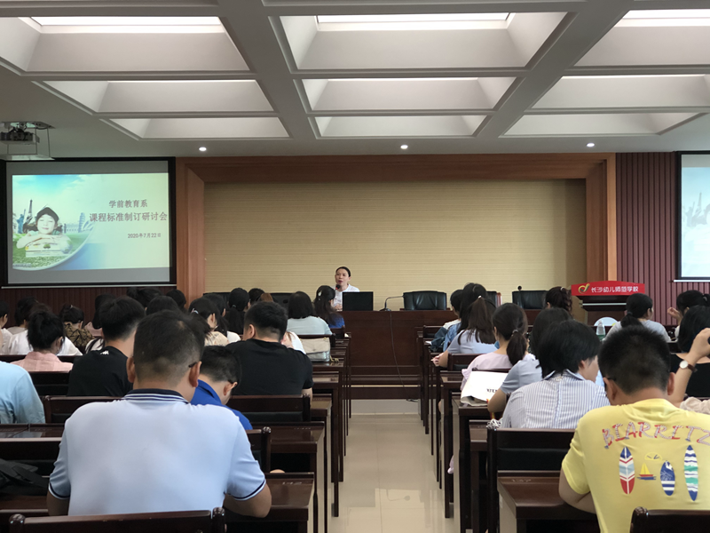 2020年7月22日上午8:30,学前教育系11位课程(群)负责人及45位课程标准制订团队成员齐聚长沙幼儿师范高等专科学校道馨楼宁觉厅,召开课程标准制订研讨会。会议由学前教育系主任阳艳波主持。