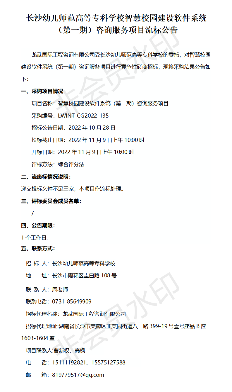 长沙幼儿师范高等专科学校智慧校园建设软件系统(第一期)咨询服务项目流标公告