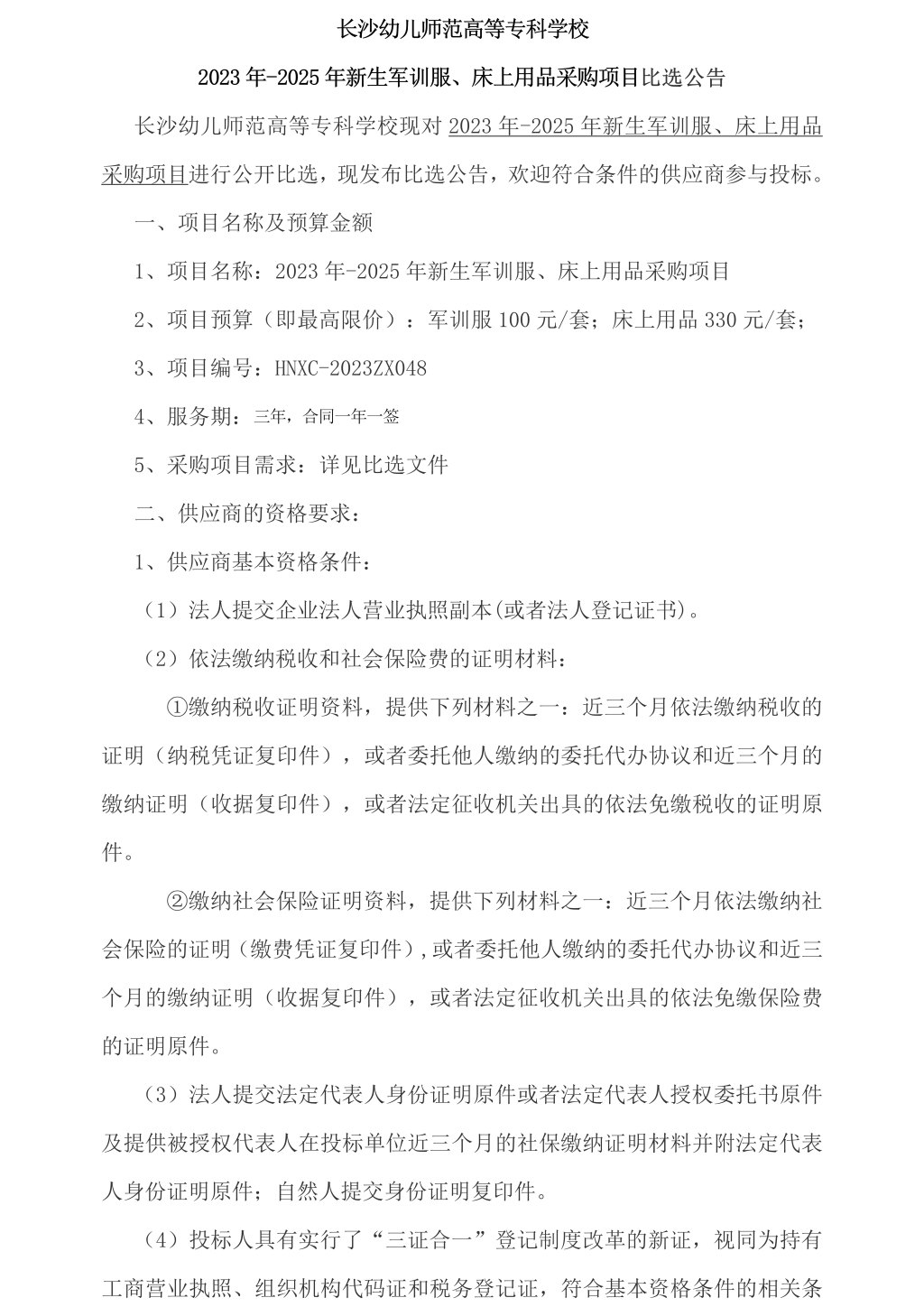 2023年-2025年新生军训服、床上用品采购项目比选公告