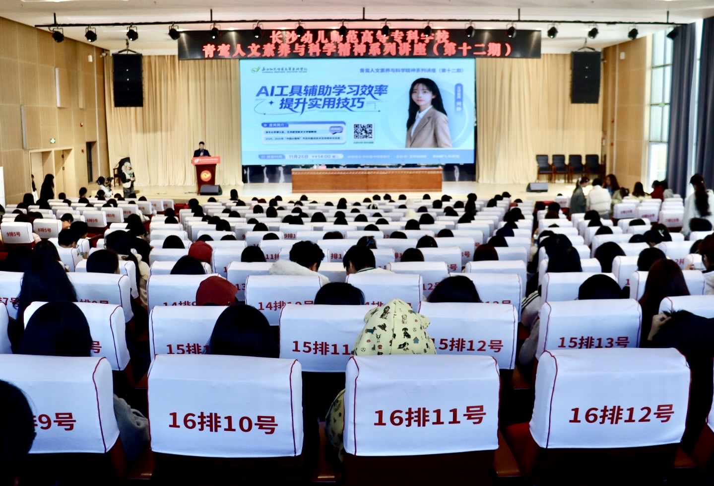 2025年11月25日下午,以“AI赋能高效学习”为主题的第十二期“青鸾”人文素养与科学精神系列讲座,在长沙幼师高专图书馆报告厅成功举办。本次讲座特邀清华大学博士后、北京航空航天大学副教授何静担任主讲,长沙幼师高专党委书记肖思源与通过预约报名前来听讲的400余名师生共同参与。本期讲座由学校宣传统战处主办,科研处承办,科研处处长何曙光主持。