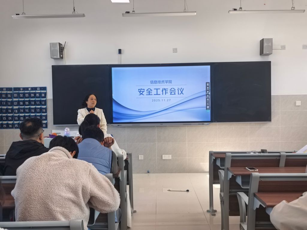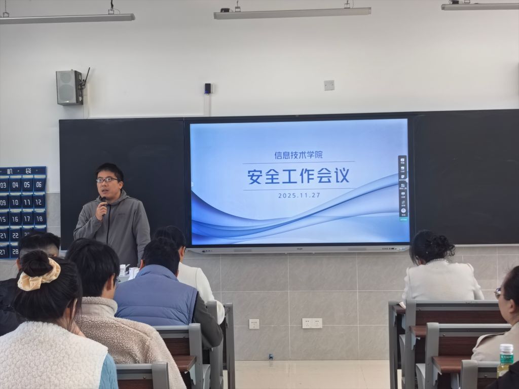 为深入贯彻落实学校安全工作部署要求,压紧压实安全责任链条,全面筑牢校园安全屏障,切实以高水平安全保障学院数智化育人高质量发展,11月27日信息技术学院在技馨楼502室召开2025年安全工作专题会议。学院院长吴佳蒂主持会议,学校信息中心副主任段胜智受邀指导并提出工作要求,学院全体教师参会。
