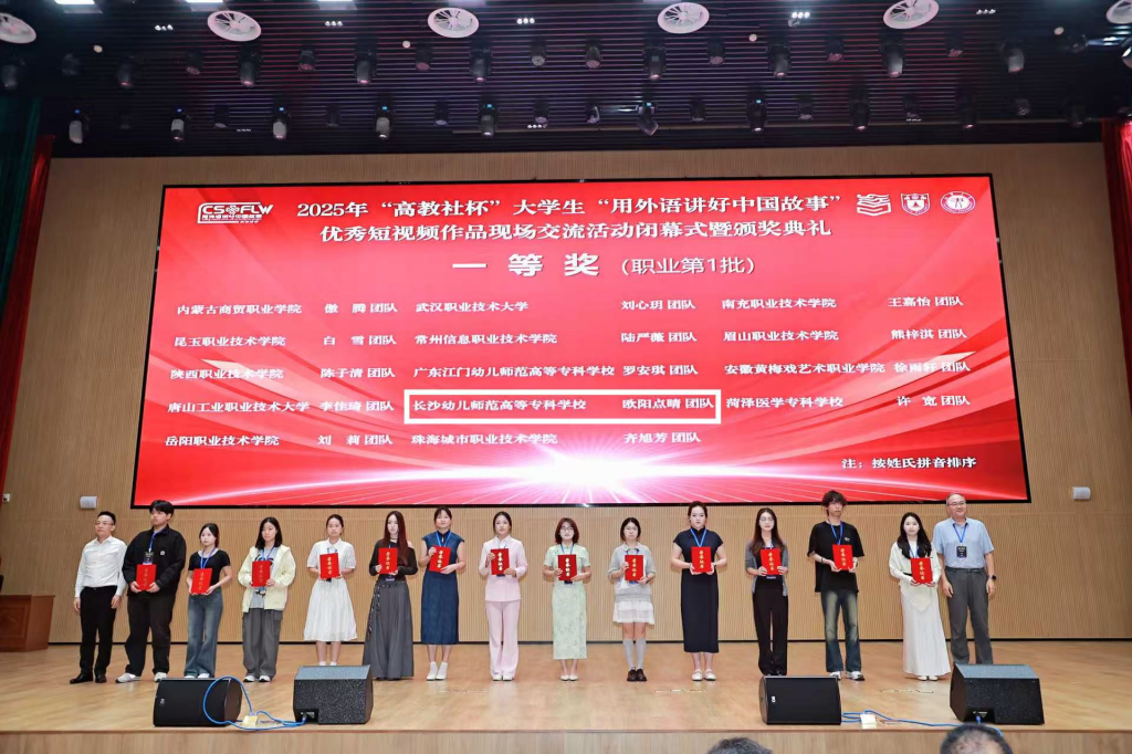 在2025“高教社”杯大学生“用外语讲好中国故事”优秀短视频作品现场交流活动中,我校学生与来自全国38支获省特等奖的高职高专院校队伍同台演讲,由周微、谭蓉老师指导的欧阳点晴、喻婧怡、许佳颖、文茜玲同学荣获全国一等奖第三名,特向获奖师生表示祝贺!