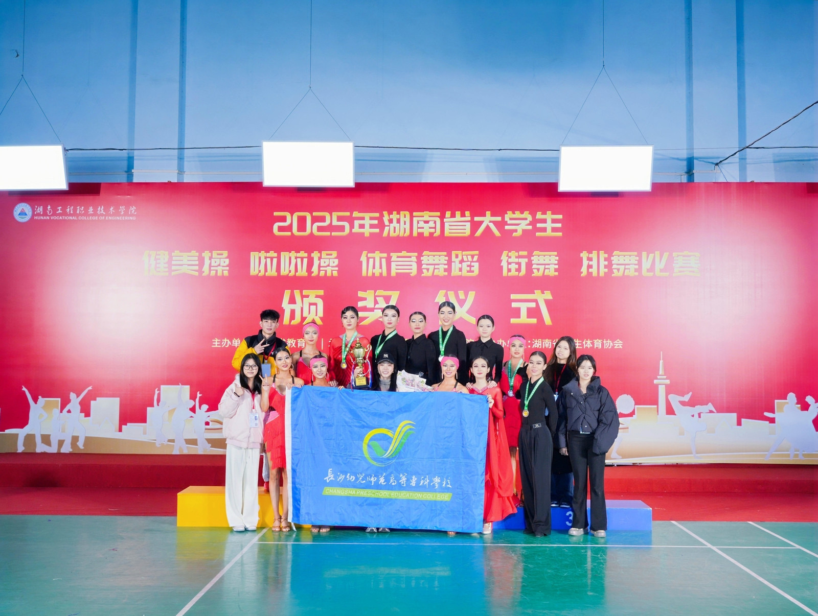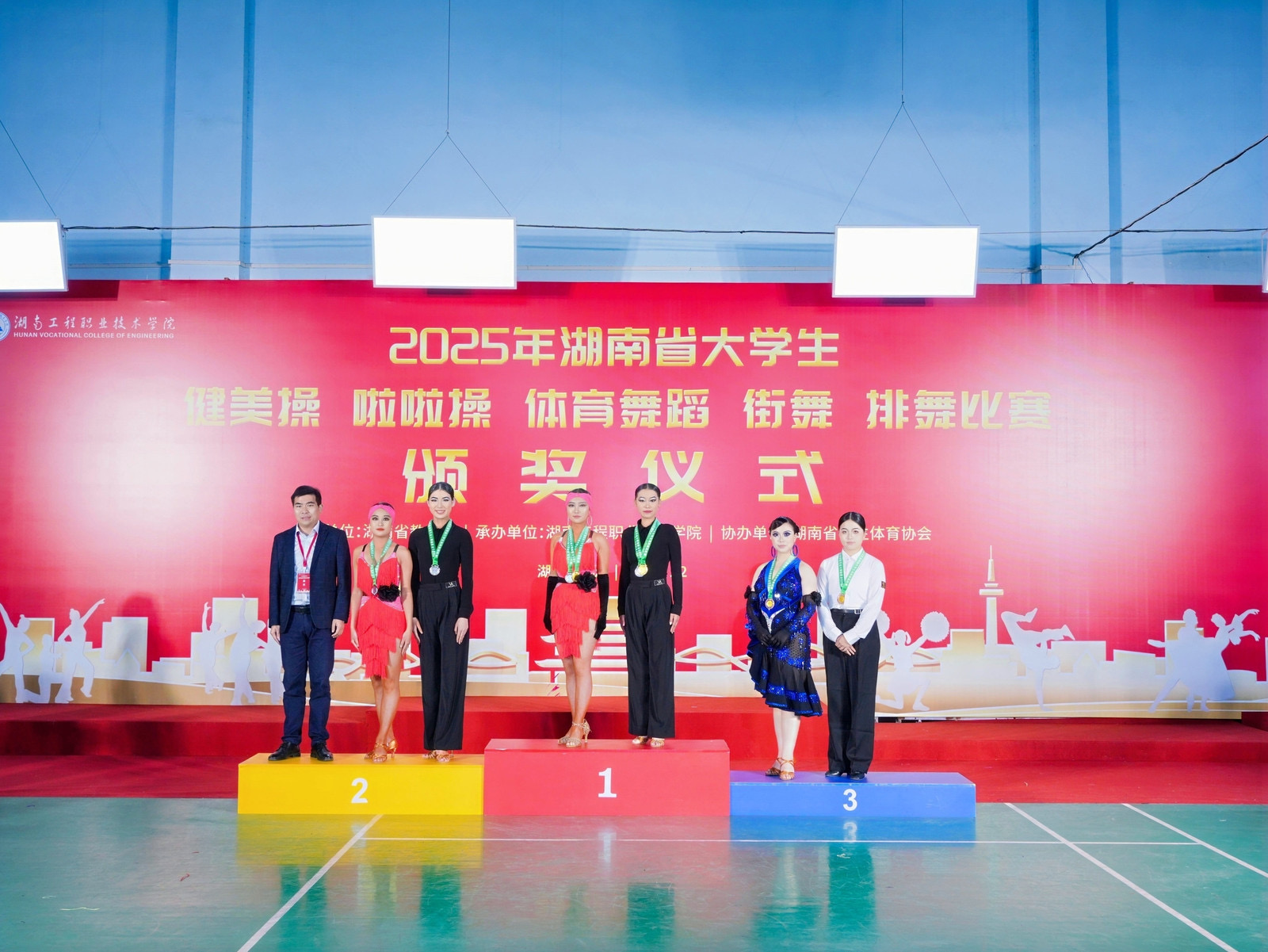 2025年湖南省大学生体育舞蹈锦标赛于12月2日至4日在湖南工程职业技术学院圆满落幕。本次赛事由湖南省教育厅主办,汇聚全省60余所高校的舞蹈精英同台竞技,场面精彩纷呈。我校体育舞蹈代表队在教练员刘燕、唐诗、周琰的带领下,首次参赛便惊艳赛场,在竞争尤为激烈的高职高专组别中,与30所高职院校及多所体育舞蹈专业院校同台PK,最终斩获3金6银5铜的亮眼战绩,以团体总分第三名的优异表现大放异彩。