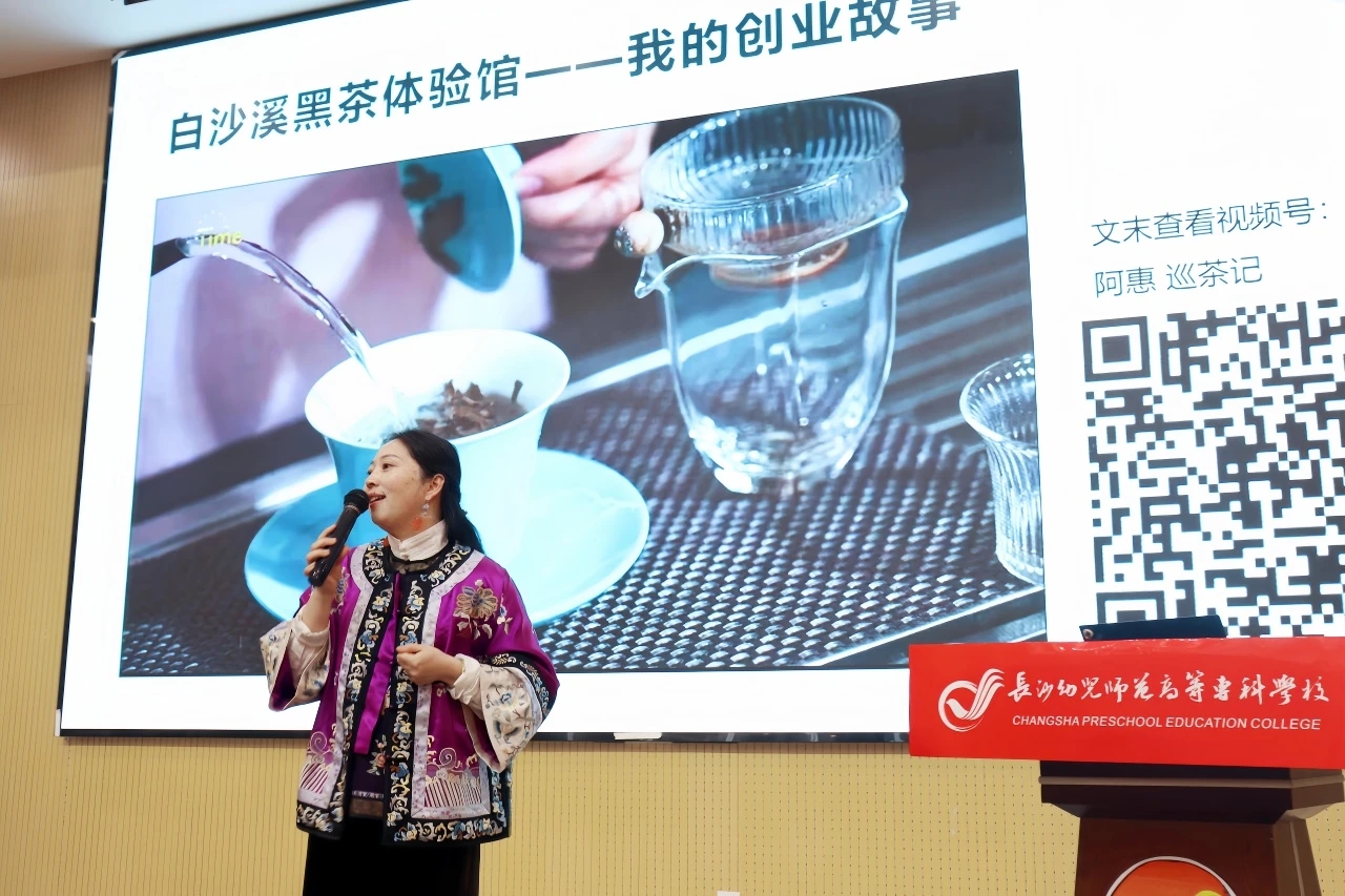 活动特邀国家二级茶艺师、高级评茶员、宁乡古道茶业商行创始人杨惠,长沙泛唯文化传播有限公司总经理杨榛,以及学院学前教育专业校友、宁乡可乐口才信息咨询服务工作室负责人刘可为三位嘉宾分享他们的创业历程与心得。