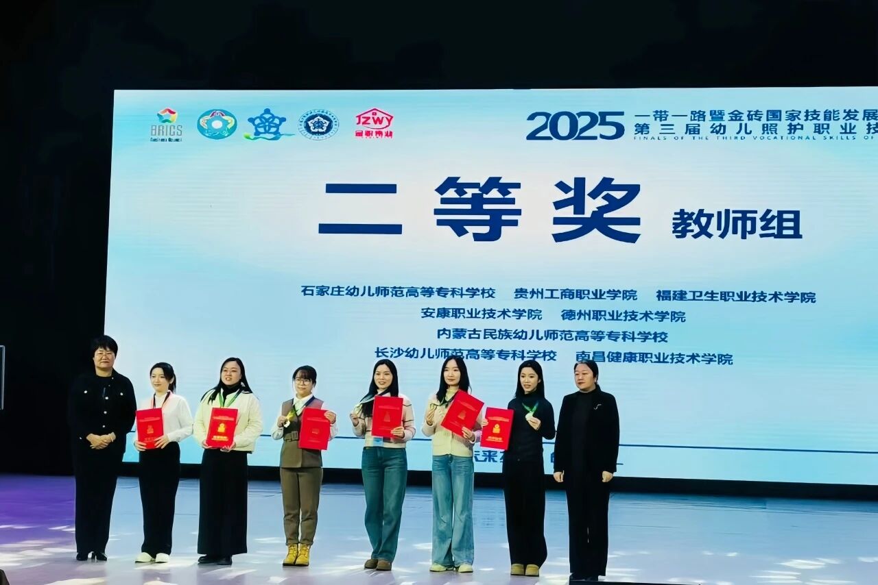 在2025年一带一路暨金砖国家技能发展与技术创新大赛中,学院多点开花。于第三届幼儿照护职业技能赛项中,罗叶琦、姚双灵、谷亚美三位老师荣获教师组二等奖,学院获评“优秀组织奖”