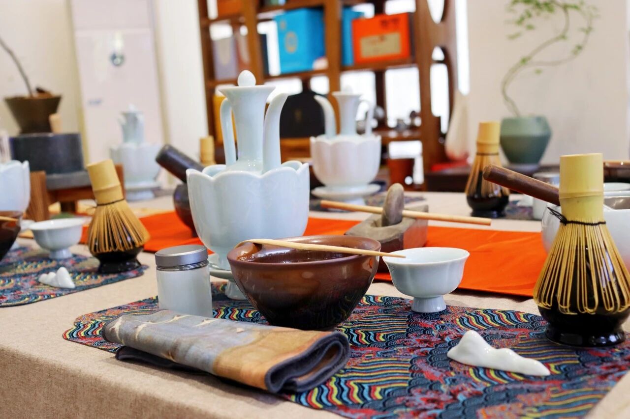茶席区内,青瓷盖碗、竹制茶筅等器具静置于原木桌上,炭火慢煮、水汽氤氲,与墙上的宋画共同勾勒出“梦华”意境。