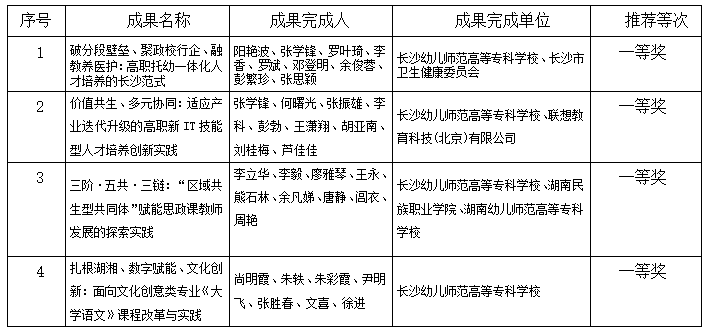 根据《湖南省教育厅关于开展2025年湖南省教学成果奖评审工作的通知》要求,经各教学部门申报、学校评审委员会严格评审,拟推荐《破分段壁垒、聚政校行企、融教养医护:高职托幼一体化人才培养的长沙范式》等4项教学成果(如下表)参评2025年湖南省职业教育教学成果奖。公示期为:2025年8月25日起至2025年8月29日止。