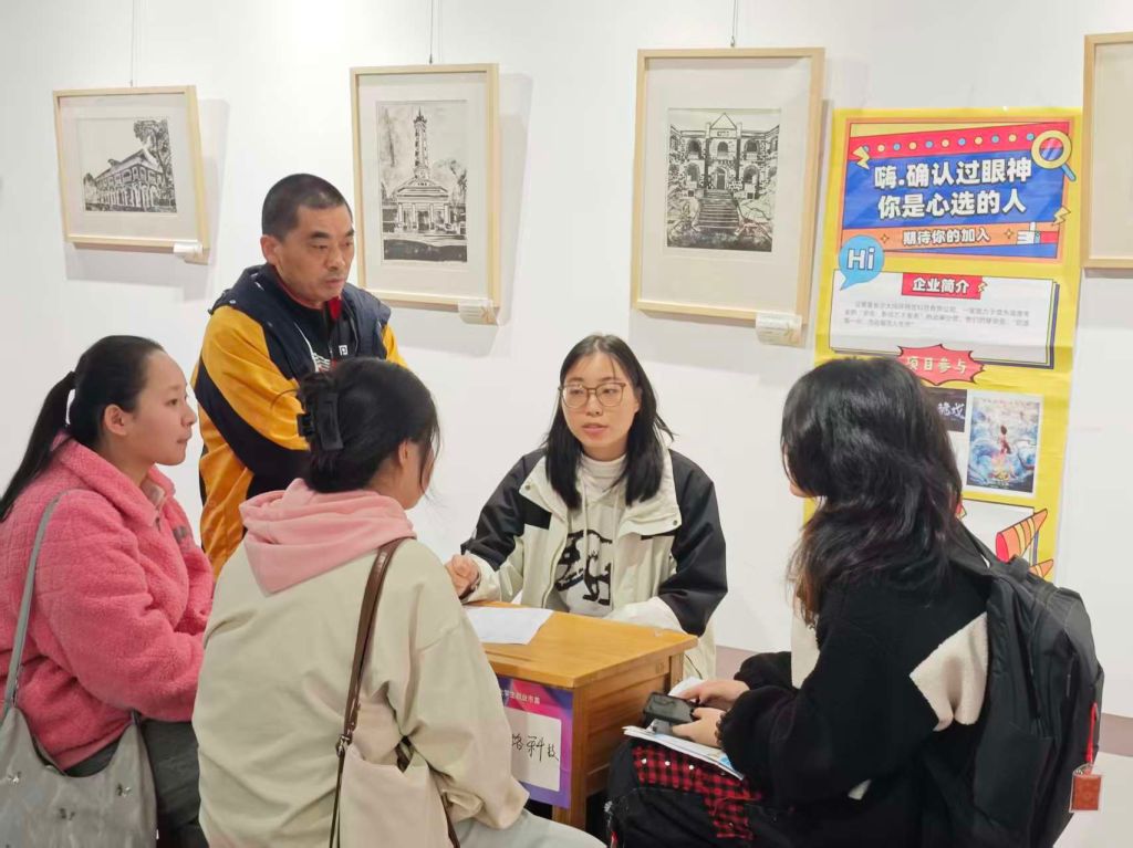 现场成效显著,活动吸引多家知名企业到场揽才,覆盖艺术设计、动漫设计、美术教育、表演艺术等多个核心领域,提供就业岗位1400余个,大批毕业生踊跃参与,咨询交流、意向沟通与初步签约环节高效推进,充分体现了活动的实用价值。为保障双选会实效,学院提前谋划前置服务,通过多场企业宣讲会精准邀约优质企业。长期以来,学院始终将学生实习就业工作置于人才培养核心位置,创新构建 “三师一体、三才育人” 全过程培养与就业指导体系,专业带头人全程深度参与,辅导员与专业教师协同配合,将育人理念融入教学、管理与服务各环节,既强化专业技能提升,也注重就业观引导,为毕业生高质量就业提供长效支撑。