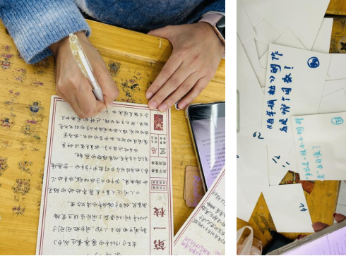 “书香飞花”以湖湘经典作品为主题开展飞花令,“沅有芷兮澧有兰,思公子兮未敢言”“先天下之忧而忧,后天下之乐而乐”,一句句经典诗句从同学们口中脱口而出。书签制作前,同学们兴致勃勃,将湖湘地标与经典名句相结合,亲手制作专属书签。有同学写下了“不以物喜,不以己悲”的箴言;有同学写下《边城》中的经典语句……小小的书签成为文化与阅读记忆的载体。经典作品推荐环节中,同学们则化身“好书推荐官”,“我推荐《芙蓉镇》,这本书里的故事就发生在我的家乡,这里不仅有优美的风景,还有好吃的米豆腐,书中充满烟火气,充满人文情怀,温暖而有力量。”通过录制短视频的方式,经典作品变得鲜活可感。地标主题灯谜和知识问答环节中,“洞庭天下水,岳阳天下楼——打一湖湘地标”“张家界所属的湘西土家族苗族自治州,孕育了哪部经典文学作品”“常德桃花源与哪位诗人的诗句相关”等题目,将湖湘地理、历史、文学与地标深度绑定。最后,当同学们通关所有环节,就能领取奖励——《边城》《芙蓉镇》,这极具代表性的湖湘文学作品。同学们捧着领到的经典书籍及奖品合影留念,笑容里满是收获与喜悦。