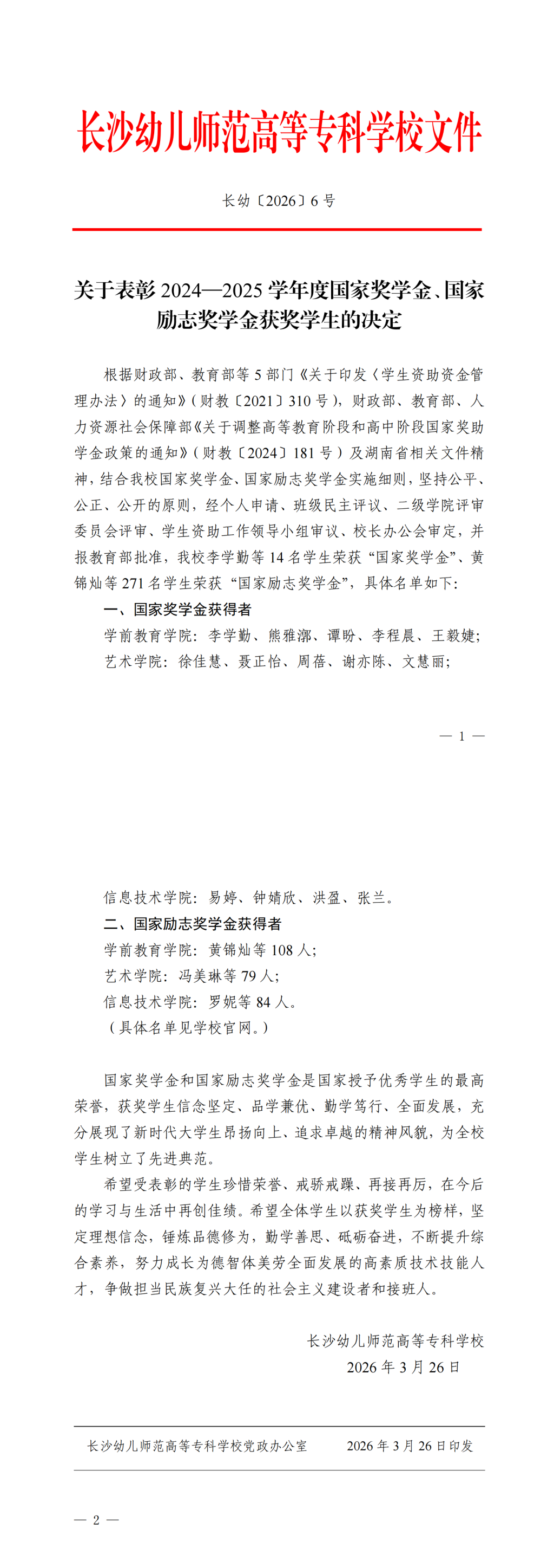 关于表彰2024—2025学年度国家奖学金、国家励志奖学金的决定