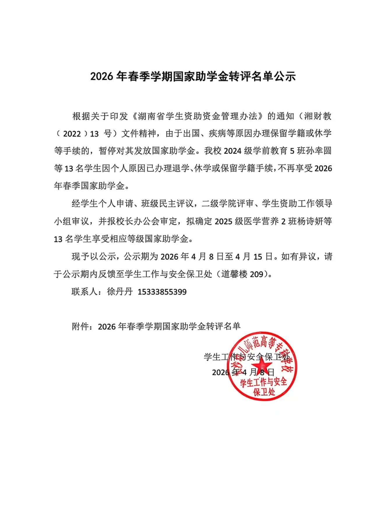 2026年春季学期国家助学金转评名单公示