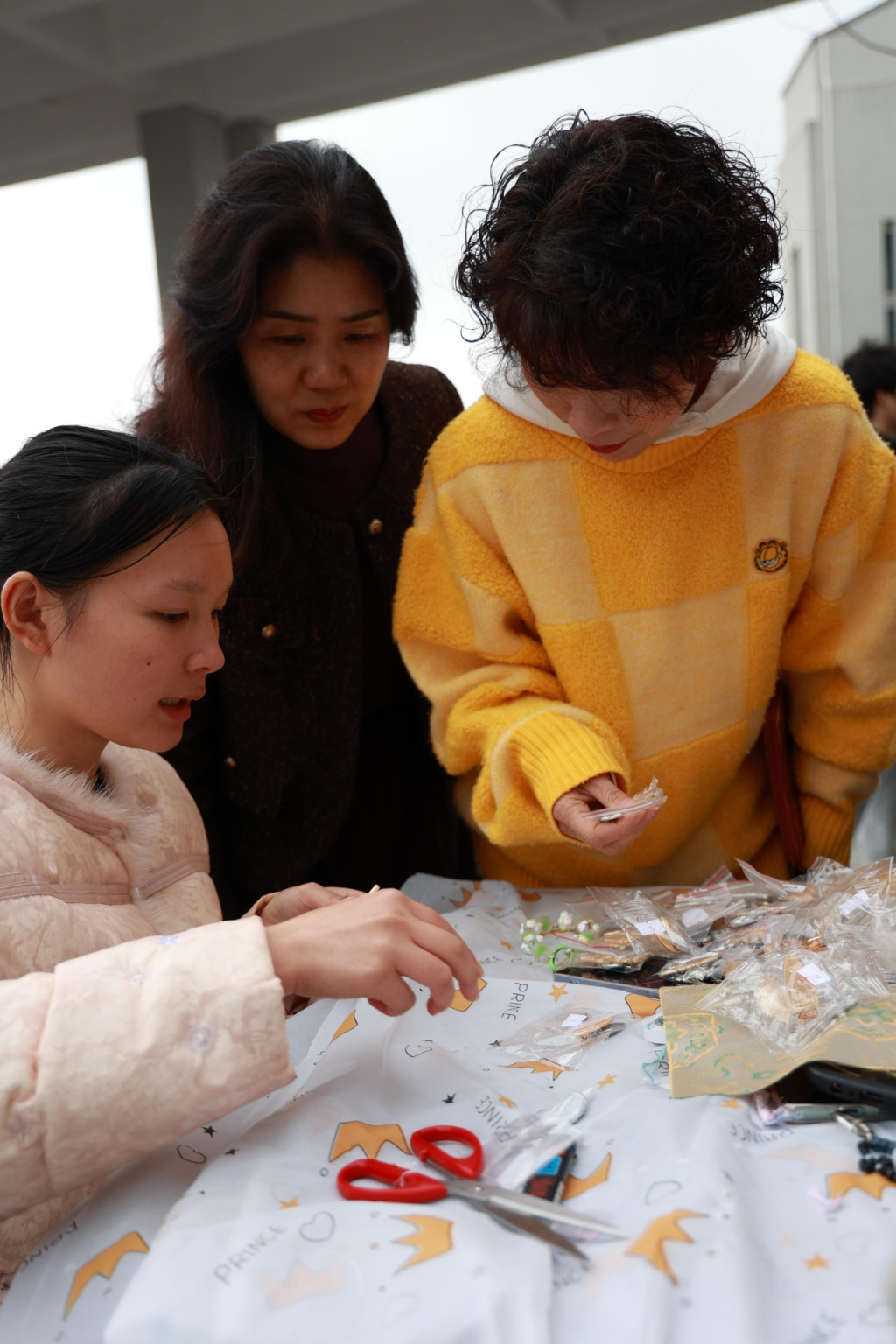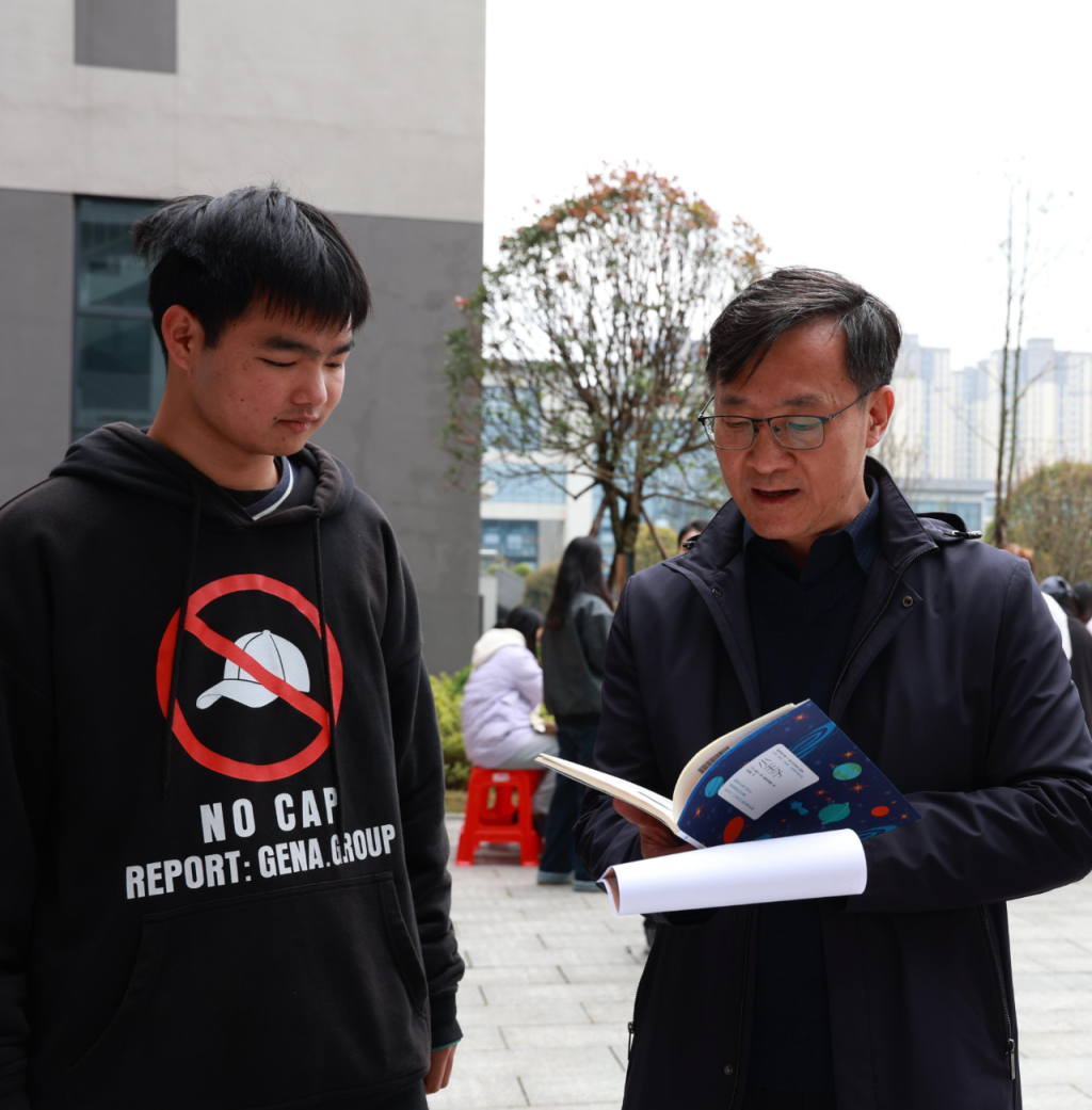 音乐厅外布置了非遗手工体验区、好书推荐区,草帽DIY、宋锦手作、漆扇体验、现场书法、剪纸、扭扭棒花DIY六大项目有序开展,构建“可看、可玩、可体验、可带走”的非遗美育街区。好书推荐区内,同学们以书会友、以文润心,让阅读成为美育的重要载体。